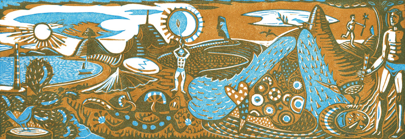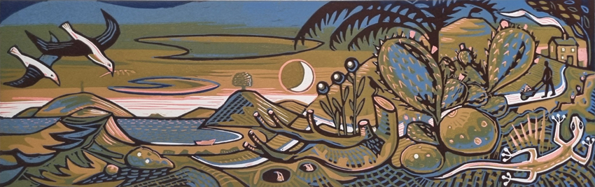 And Island Life, a reduction linocut in and edition of 10 copies, some with a face in the moon, a picture of happiness in solitude.